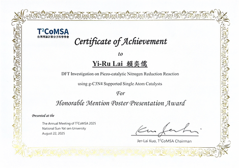 Congratulations to Master's student Matt for winning "The Annual Meeting of the Taiwan Theoretical and Computational Molecular Sciences Association 2025 - Honorable Mention Poster Presentation"